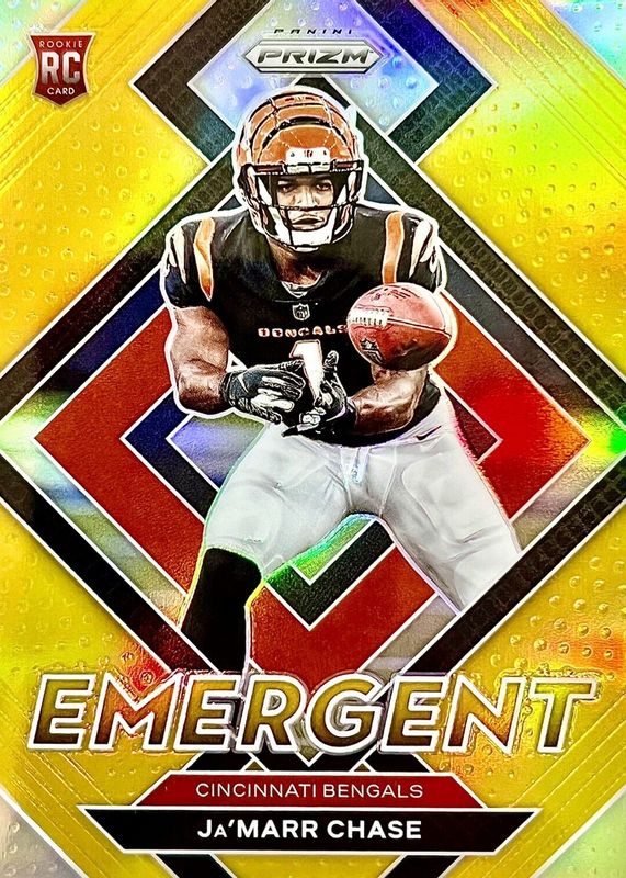 The Ja'Marr Chase 2021 Prizm #E-7 Emergent - Gold /10 Rookie card in Raw condition has not changed in price in the last 30 days and was last sold for $200.00 .
