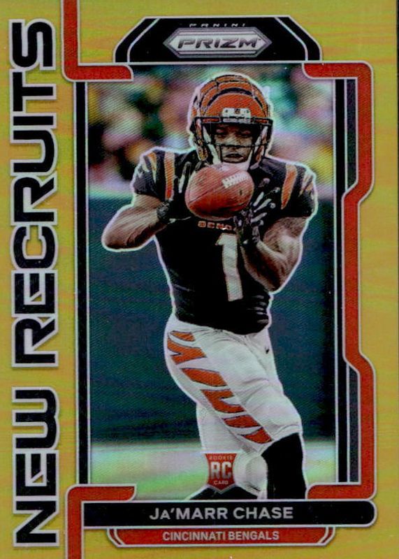 The Ja'Marr Chase 2021 Prizm #NR-7 New Recruits - Gold /10 Rookie card in Raw condition has not changed in price in the last 30 days and was last sold for $86.08 .