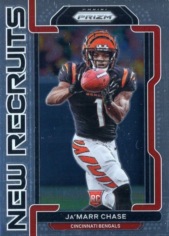 The Ja'Marr Chase 2021 Prizm #NR-7 New Recruits Rookie card in Raw condition has moved up $0.76 (+76.8%) in the last 30 days and was last sold for $1.75 .