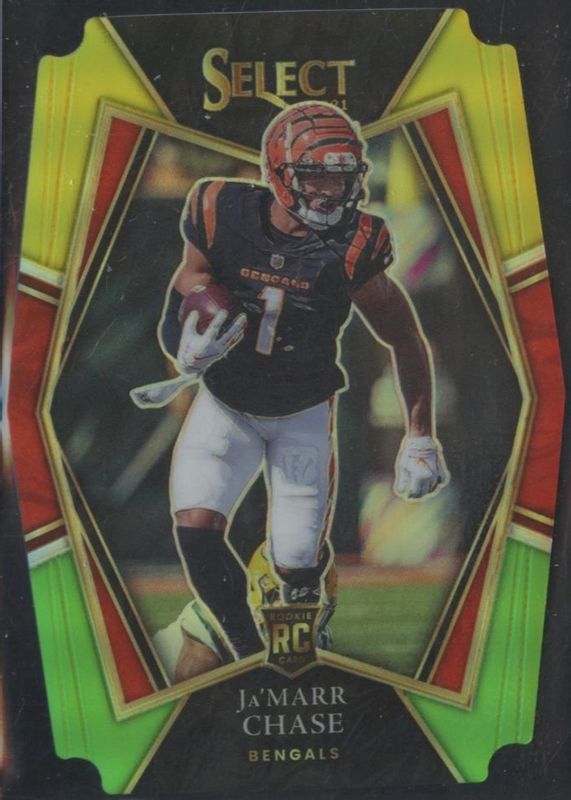The Ja'Marr Chase 2021 Select #147 Premier Level Green & Yellow Die-Cut Rookie card in Raw condition has moved up $1.01 (+16.8%) in the last 30 days and was last sold for $7.00 .