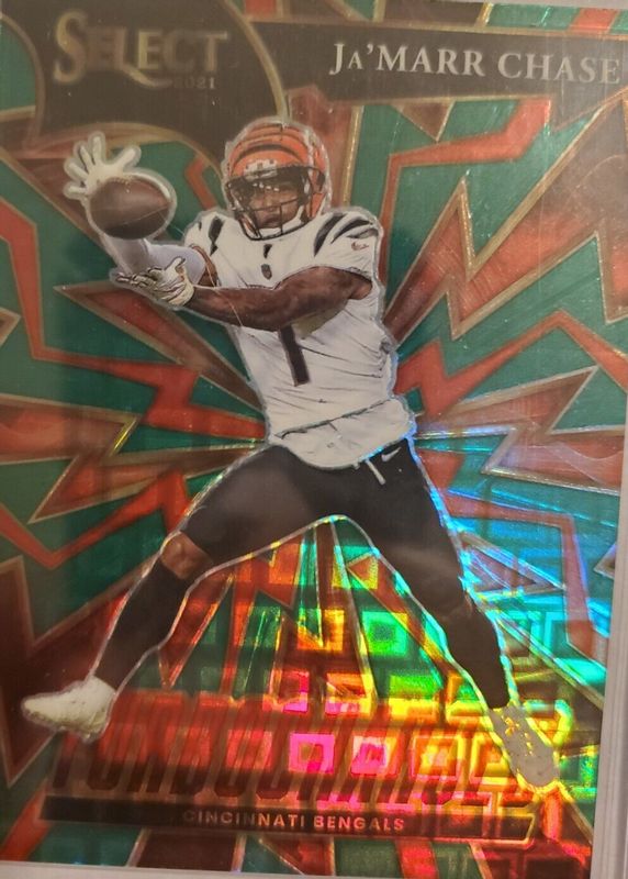 The Ja'Marr Chase 2021 Select #TUR-8 Turbocharged - Green /5 Rookie card in Raw condition has not changed in price in the last 30 days and was last sold for $81.60 .