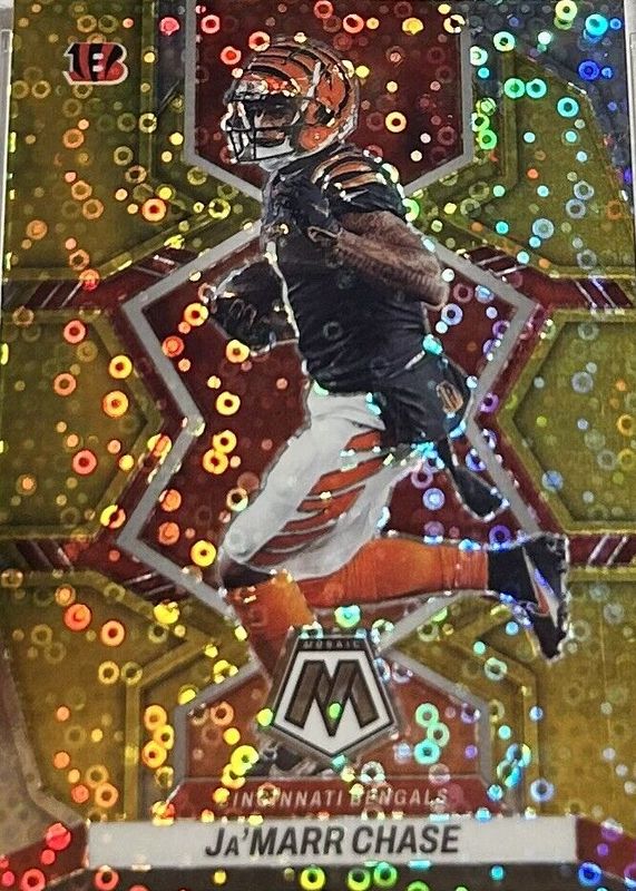 This card is 1 of 26 Ja'Marr Chase's card variations in the 2022 Mosaic set being tracked by Sports Card Investor, including Blue /99, Choice Fusion Red & Yellow /80, No Huddle Blue /75, Choice Peacock /(SSP), and Genesis /(SSP).