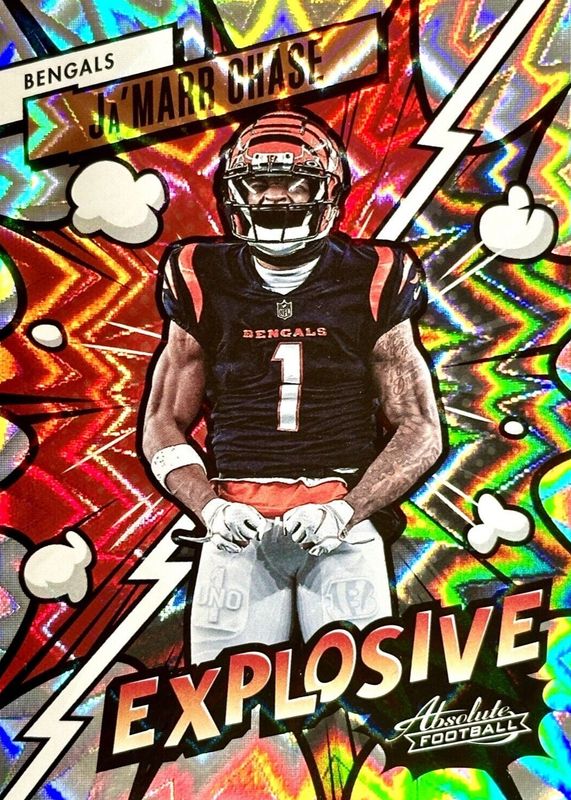 This card is 1 of 6 Ja'Marr Chase's card variations in the 2023 Absolute set being tracked by Sports Card Investor, including Kaboom! (Vertical), Explosive - Gold /10, Kaboom! (Vertical) - Gold /10, Explosive - Green /1, and Kaboom! (Vertical) - Green /1.