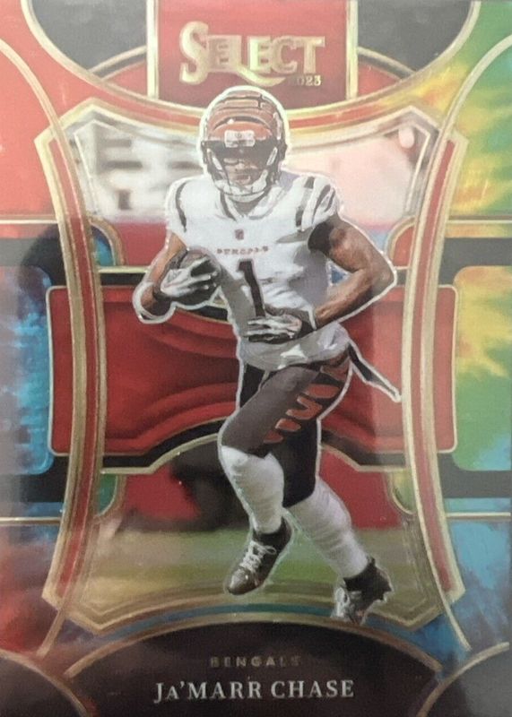 This card is 1 of 43 Ja'Marr Chase's card variations in the 2023 Select set being tracked by Sports Card Investor, including Field Level Cosmic /(SSP), Field Level Tiger /(SSP), Field Level Zebra /(SSP), Suite Level Cosmic /(SSP), and Suite Level Tiger /(SSP).