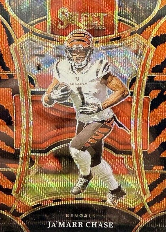 This card is 1 of 43 Ja'Marr Chase's card variations in the 2023 Select set being tracked by Sports Card Investor, including Field Level Cosmic /(SSP), Field Level Tiger /(SSP), Field Level Zebra /(SSP), Suite Level Cosmic /(SSP), and Suite Level Zebra /(SSP).