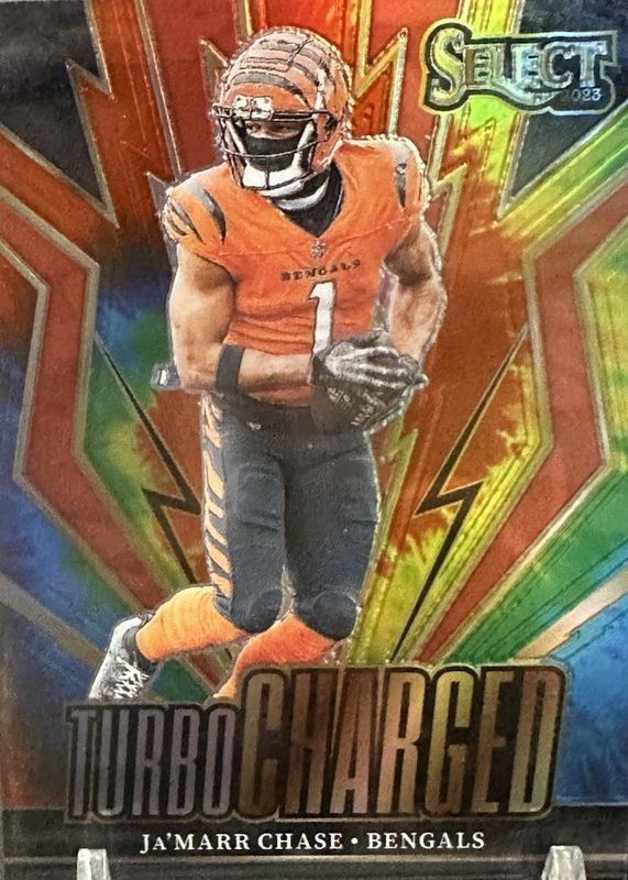 The Ja'Marr Chase 2023 Select #TUR-JCH Turbocharged - Tie-Dye /25 card in Raw condition has not changed in price in the last 30 days and was last sold for $46.32 .