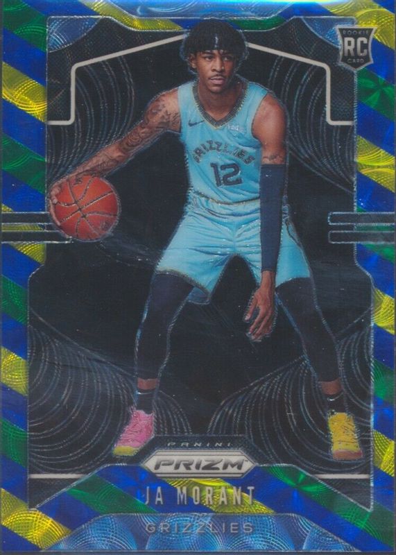 The Ja Morant 2019 Prizm #249 Choice Blue Yellow Green Rookie card in Raw condition has moved down -$44.37 (-74.0%) in the last 30 days and was last sold for $15.62 .