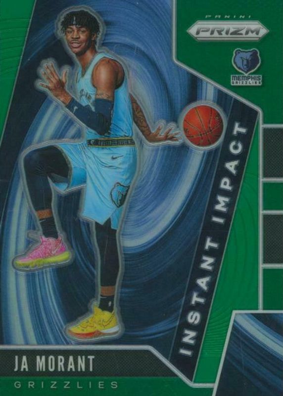 The Ja Morant 2019 Prizm #12 Instant Impact - Green Rookie card in Raw condition has moved down -$2.00 (-53.3%) in the last 30 days and was last sold for $1.75 .