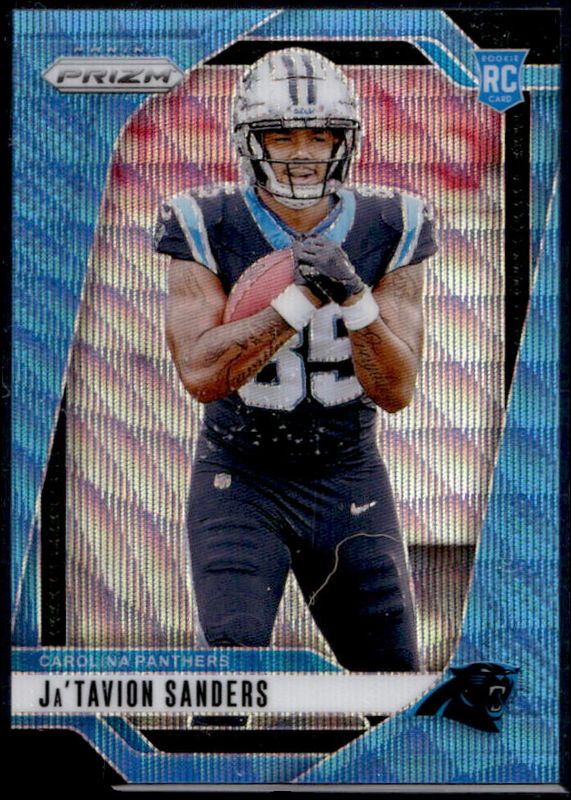 The Ja'Tavion Sanders 2024 Prizm #343 Blue Wave /230 Rookie card is 1 of 103 Ja'Tavion Sanders' card variations in the 2024 Prizm set being tracked by Sports Card Investor, including Base, Choice Blue Yellow Green, Choice Silver, Disco, and Green.