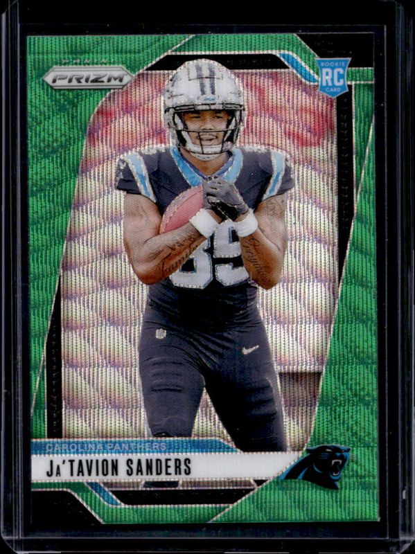 The Ja'Tavion Sanders 2024 Prizm #343 Green Wave Rookie card is 1 of 103 Ja'Tavion Sanders' card variations in the 2024 Prizm set being tracked by Sports Card Investor, including Base, Choice Blue Yellow Green, Choice Silver, Disco, and Green.