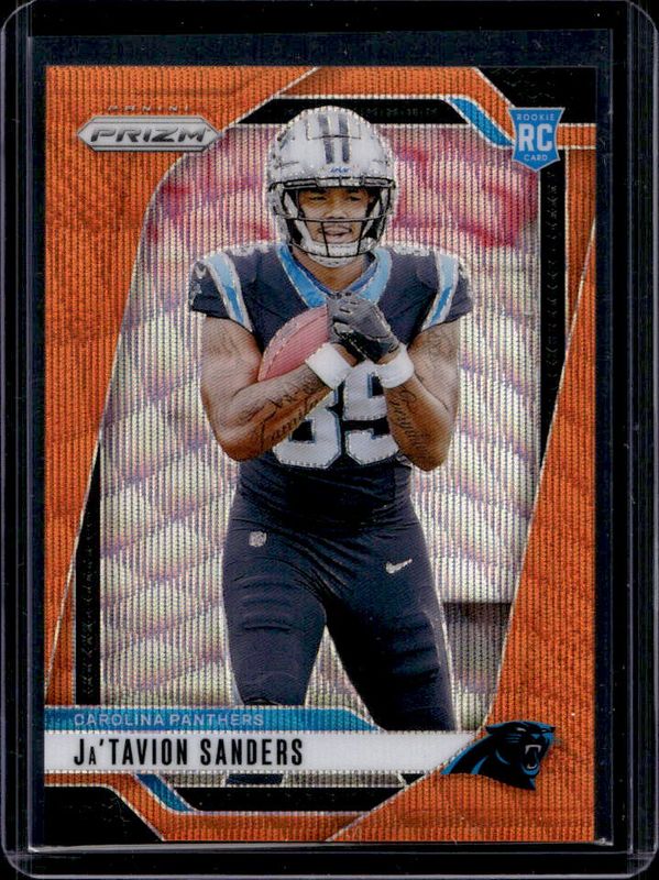 The Ja'Tavion Sanders 2024 Prizm #343 Orange Wave /60 Rookie card is 1 of 103 Ja'Tavion Sanders' card variations in the 2024 Prizm set being tracked by Sports Card Investor, including Base, Choice Blue Yellow Green, Choice Silver, Disco, and Green.