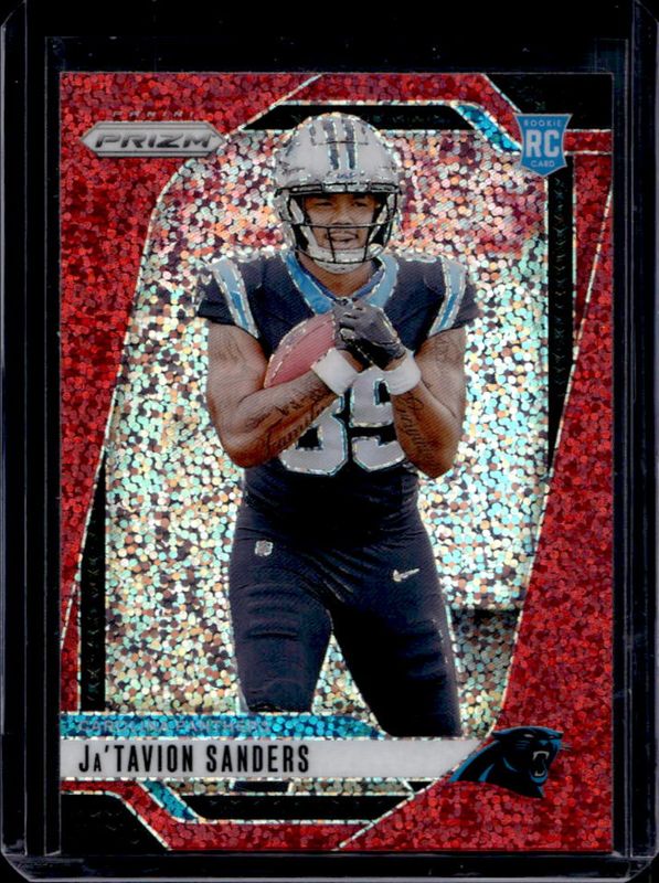 The Ja'Tavion Sanders 2024 Prizm #343 Red Sparkle /(SSP) Rookie card is 1 of 103 Ja'Tavion Sanders' card variations in the 2024 Prizm set being tracked by Sports Card Investor, including Base, Choice Blue Yellow Green, Choice Silver, Disco, and Green.