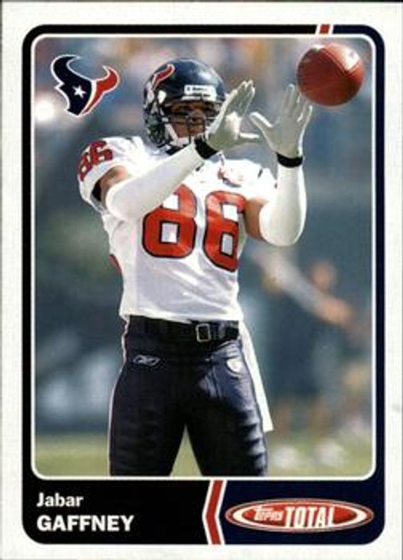 The Jabar Gaffney 2003 Topps Total #141 Base card is 1 of 2 Jabar Gaffney's card variations in the 2003 Topps Total set being tracked by Sports Card Investor, including Silver.