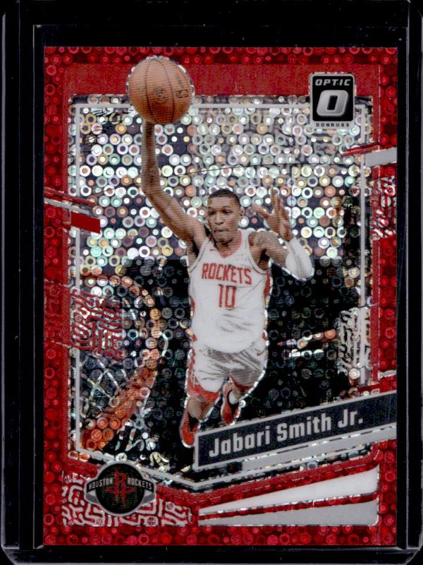 The Jabari Smith 2023 Optic #164 Fast Break Red /75 card is 1 of 62 Jabari Smith's card variations in the 2023 Optic set being tracked by Sports Card Investor, including Base, Blue Velocity, Checkerboard, Choice Red & Green, and Fast Break.