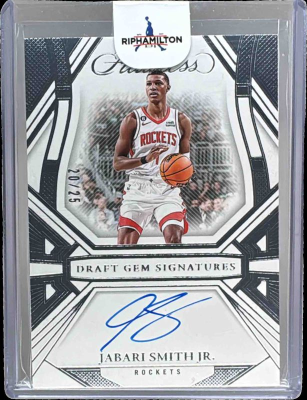 The Jabari Smith 2024 Flawless #2 2023 Draft Gem Signatures /25 card is 1 of 41 Jabari Smith's card variations in the 2024 Flawless set being tracked by Sports Card Investor, including 2023 Excellence Signatures /25, 2023 Flawless Patch Autographs /25, 2023 Flawless Shade Signatures /25, Flawless Focus Autographs /25, and Vertical Patch Auto /25.