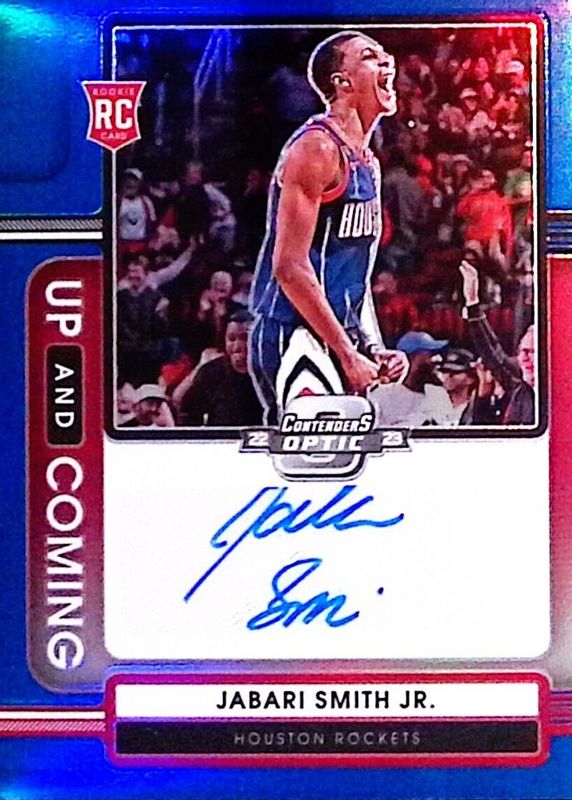 The Jabari Smith Jr. 2022 Contenders Optic #UCA-JSJ Up and Coming Autographs - Blue (/75) Rookie card in Raw condition has moved up $0.88 (+6.1%) in the last 30 days and was last sold for $15.38 .