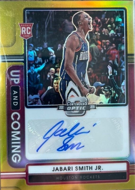 The Jabari Smith Jr. 2022 Contenders Optic #UCA-JSJ Up and Coming Autographs - Gold /10 Rookie card in Raw condition has not changed in price in the last 30 days and was last sold for $305.00 .