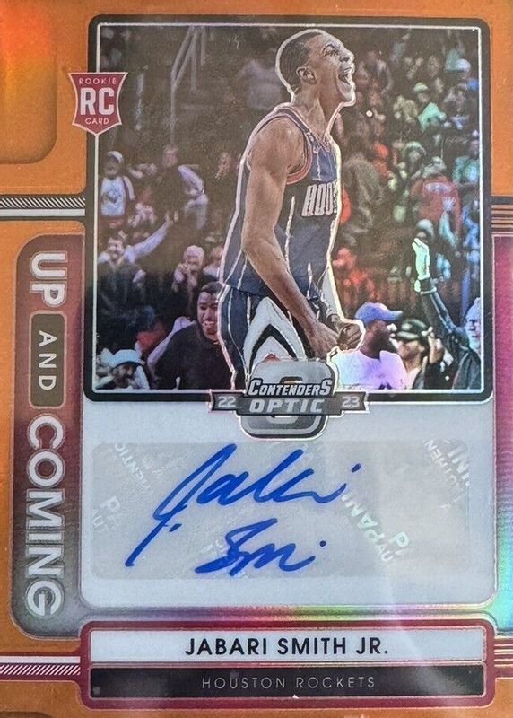 The Jabari Smith Jr. 2022 Contenders Optic #UCA-JSJ Up and Coming Autographs - Orange /25 Rookie card in Raw condition has not changed in price in the last 30 days and was last sold for $40.00 .