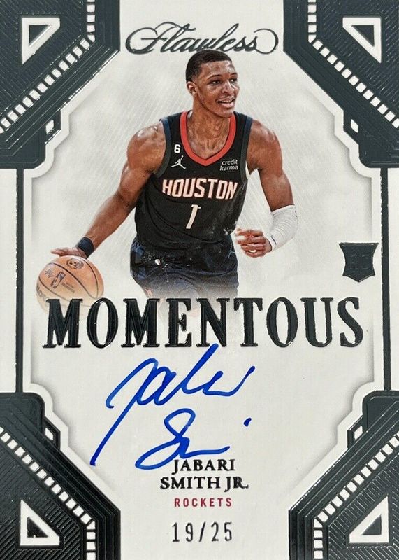 The Jabari Smith Jr. 2022 Flawless #MA-JSJ Momentous Autographs /25 Rookie card in Raw condition has not changed in price in the last 30 days and was last sold for $255.00 .