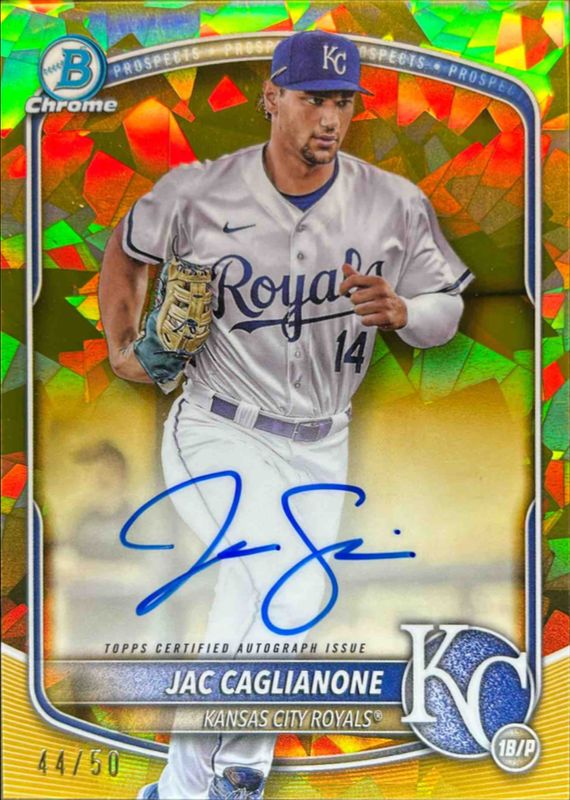 The Jac Caglianone 2025 Bowman Sapphire Edition #CPS-JCA Chrome Prospect Autographs - Gold Refractor /50 card is 1 of 25 Jac Caglianone's card variations in the 2025 Bowman Sapphire Edition set being tracked by Sports Card Investor, including Chrome Prospects, Sapphire Selections, Sapphire Selections Autographs, Chrome Prospect Autographs /199, and Chrome Prospect Autographs - Green Refractor /99.