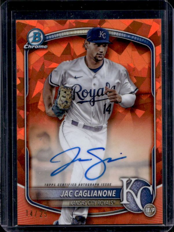 The Jac Caglianone 2025 Bowman Sapphire Edition #CPS-JCA Chrome Prospect Autographs - Orange Refractor /25 card is 1 of 25 Jac Caglianone's card variations in the 2025 Bowman Sapphire Edition set being tracked by Sports Card Investor, including Chrome Prospects, Sapphire Selections, Sapphire Selections Autographs, Chrome Prospect Autographs /199, and Chrome Prospect Autographs - Green Refractor /99.