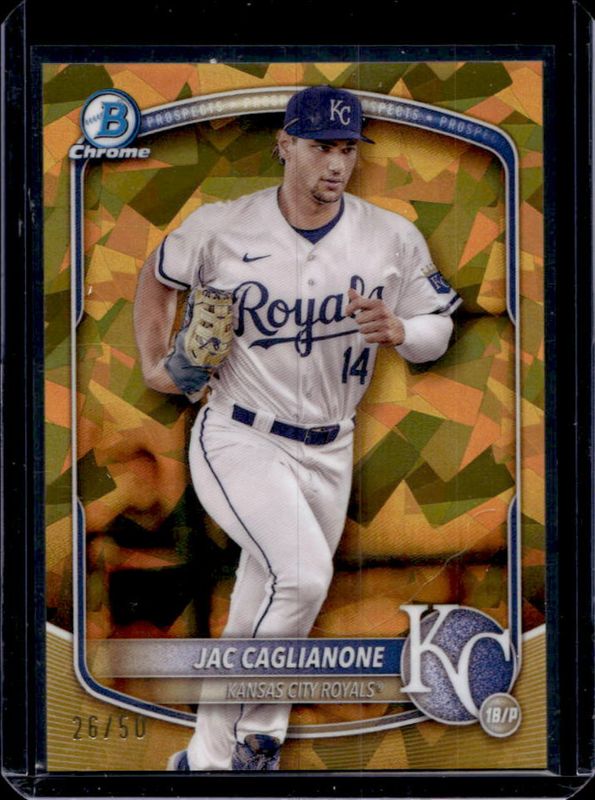 The Jac Caglianone 2025 Bowman Sapphire Edition #BCP-103 Chrome Prospects - Gold Refractor /50 card is 1 of 25 Jac Caglianone's card variations in the 2025 Bowman Sapphire Edition set being tracked by Sports Card Investor, including Chrome Prospects, Sapphire Selections, Sapphire Selections Autographs, Chrome Prospect Autographs /199, and Chrome Prospect Autographs - Green Refractor /99.