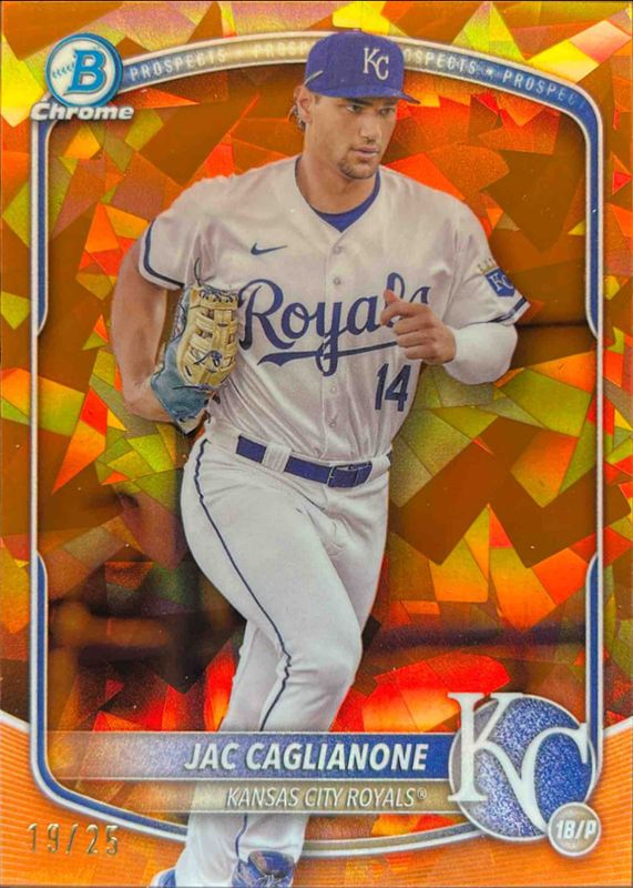 The Jac Caglianone 2025 Bowman Sapphire Edition #BCP-103 Chrome Prospects - Orange Refractor /25 card is 1 of 25 Jac Caglianone's card variations in the 2025 Bowman Sapphire Edition set being tracked by Sports Card Investor, including Chrome Prospects, Sapphire Selections, Sapphire Selections Autographs, Chrome Prospect Autographs /199, and Chrome Prospect Autographs - Green Refractor /99.