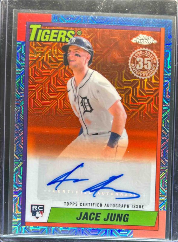 The Jace Jung 2025 Topps #90CA-JJ 1990 Baseball Chrome Silver Pack Autographs (Series 1) - Orange Refractor /25 Rookie card is 1 of 185 Jace Jung's card variations in the 2025 Topps set being tracked by Sports Card Investor, including Base, Aqua Holo Foil, Aqua Rainbow, Diamante Foil, and Eggs.