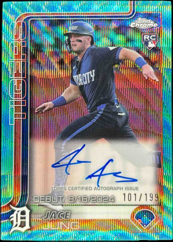 The Jace Jung 2025 Topps Chrome Update #CRDA-JJ Rookie Debut Autographs - Aqua Wave Refractor /199 card is 1 of 129 Jace Jung's card variations in the 2025 Topps Chrome Update set being tracked by Sports Card Investor, including Base, Rookie Debut, Geometric Refractor, Negative Refractor, and Prism Refractor.