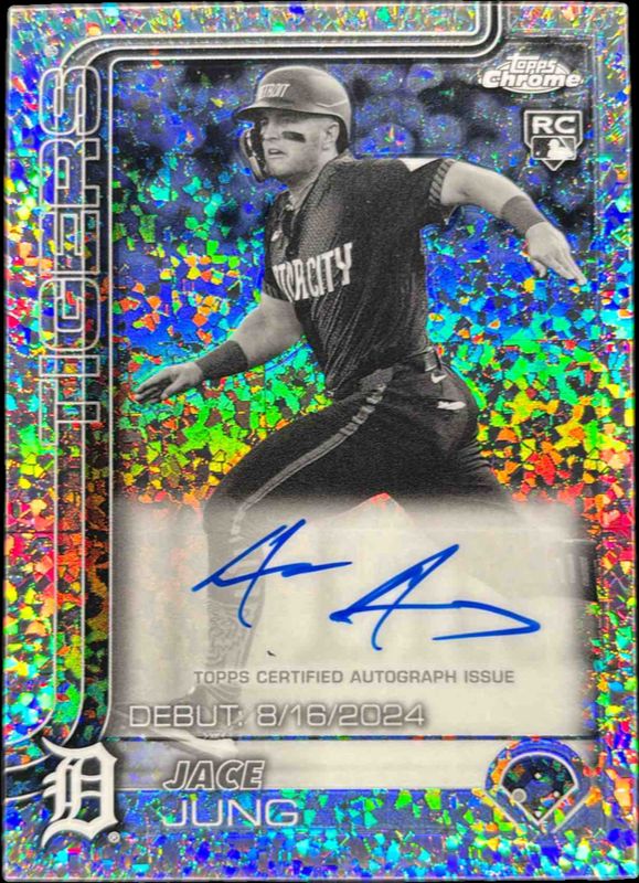 The Jace Jung 2025 Topps Chrome Update #CRDA-JJ Rookie Debut Autographs - Black & White Mini-Diamond Refractor card is 1 of 129 Jace Jung's card variations in the 2025 Topps Chrome Update set being tracked by Sports Card Investor, including Base, Rookie Debut, Geometric Refractor, Negative Refractor, and Prism Refractor.
