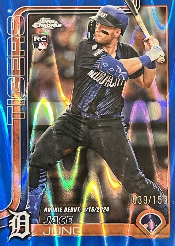 Best Prices Available For Sale of Jace Jung 2025 Topps Chrome Update #USC121 Rookie Debut - Blue RayWave Refractor /150
