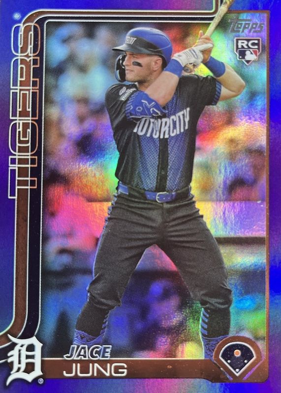 The Jace Jung 2025 Topps #80 Purple Rainbow /250 Rookie card in Raw condition has moved up $9.01 (+910%) in the last 30 days and was last sold for $10.00 .