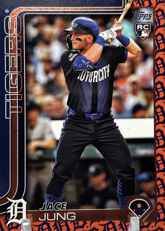 This card is 1 of 185 Jace Jung's card variations in the 2025 Topps set being tracked by Sports Card Investor, including Base, Aqua Holo Foil, Aqua Rainbow, Diamante Foil, and Eggs.