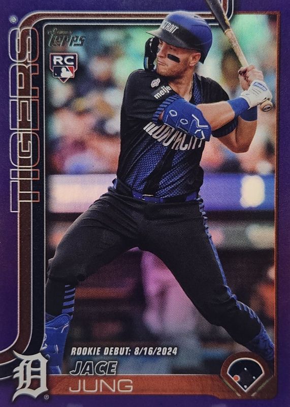 The Jace Jung 2025 Topps Update #US93 Rookie Debut - Purple Rainbow Foil /250 card in Raw condition has not changed in price in the last 30 days and was last sold for $5.99 .