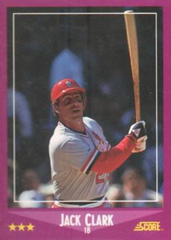 The Jack Clark 1988 Score #100 Glossy card is 1 of 2 Jack Clark's card variations in the 1988 Score set being tracked by Sports Card Investor, including Base.