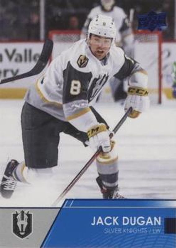 The Jack Dugan 2021 Upper Deck AHL #9 Blue card is 1 of 9 Jack Dugan's card variations in the 2021 Upper Deck AHL set being tracked by Sports Card Investor, including Base, Exclusives /100, High Gloss /10, Autographs, and Printing Plates - Black /1.