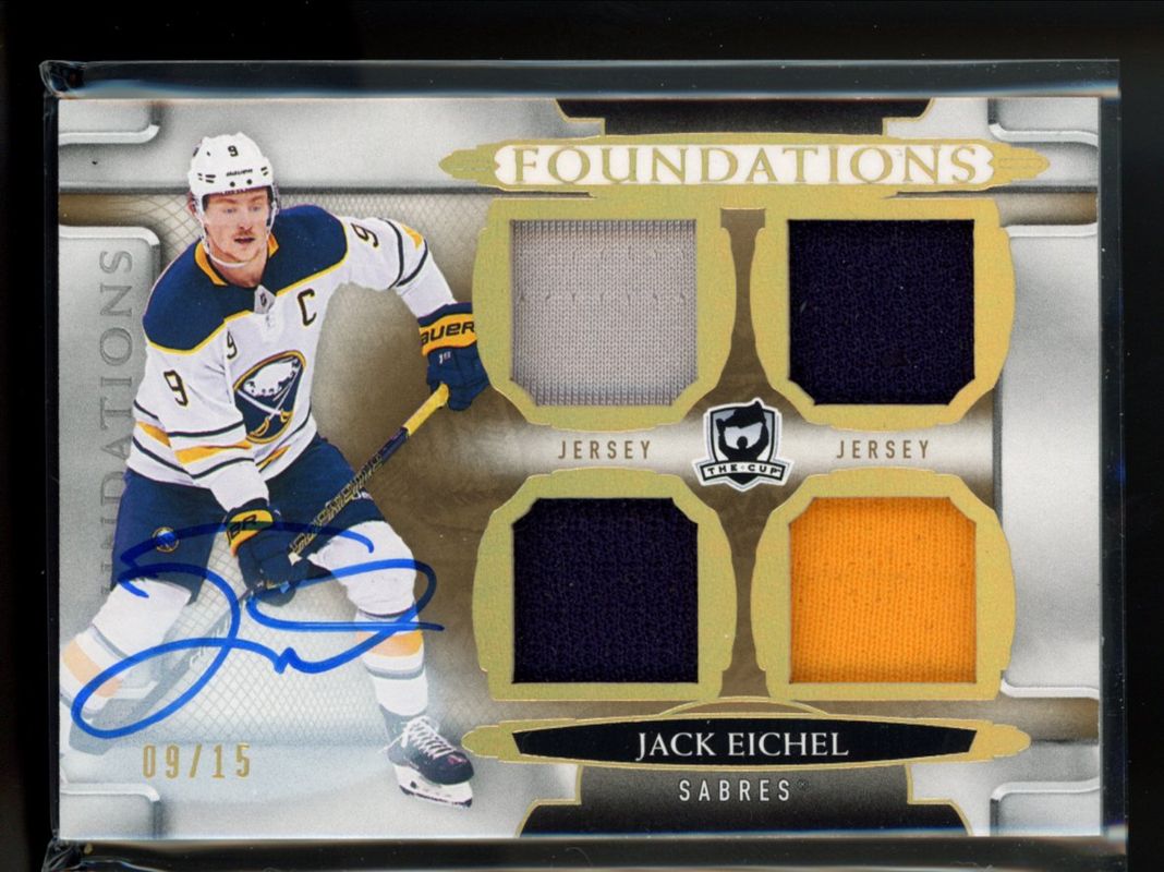 The Jack Eichel 2018 Upper Deck The Cup #F-JE Cup Foundations Jersey Autographs /15 card is 1 of 39 Jack Eichel's card variations in the 2018 Upper Deck The Cup set being tracked by Sports Card Investor, including Base /249, Gold Spectrum Foil /36, Gold Foil /24, Green Foil Button /3, and Red Foil /2.