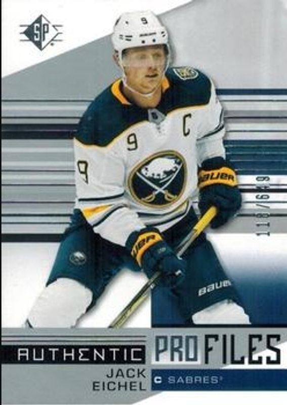 The Jack Eichel 2019 SP #AP-JE Authentic Profiles /649 card is 1 of 6 Jack Eichel's card variations in the 2019 SP set being tracked by Sports Card Investor, including Base /1199, Blue, Authentic Profiles - Blue, Authentic Profiles Jersey, and Authentic Profiles Signatures.