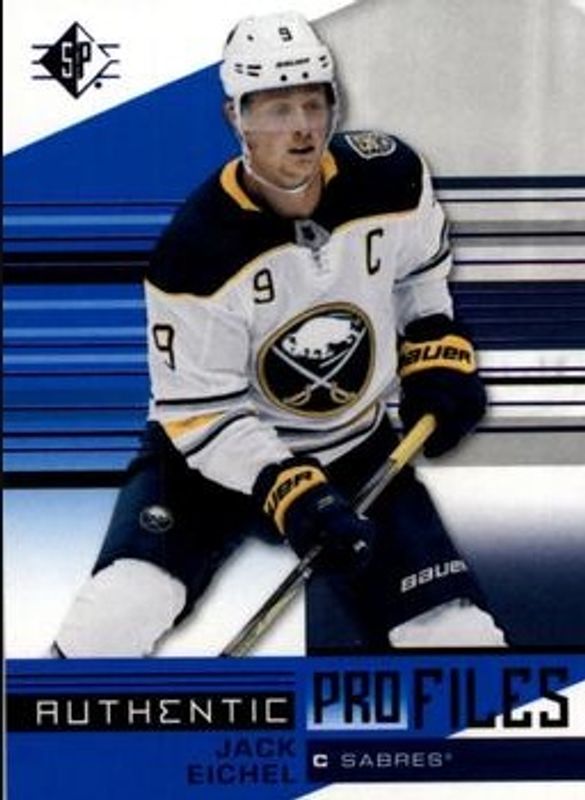 The Jack Eichel 2019 SP #AP-JE Authentic Profiles - Blue card is 1 of 6 Jack Eichel's card variations in the 2019 SP set being tracked by Sports Card Investor, including Base /1199, Blue, Authentic Profiles Jersey, Authentic Profiles Signatures, and Authentic Profiles /649.