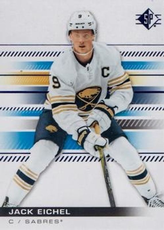 The Jack Eichel 2019 SP #62 Blue card is 1 of 6 Jack Eichel's card variations in the 2019 SP set being tracked by Sports Card Investor, including Base /1199, Authentic Profiles - Blue, Authentic Profiles Jersey, Authentic Profiles Signatures, and Authentic Profiles /649.
