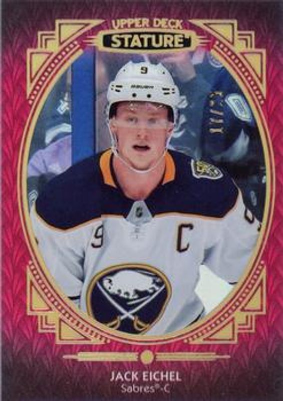 The Jack Eichel 2020 Upper Deck Stature #14 Portrait Red /25 card is 1 of 27 Jack Eichel's card variations in the 2020 Upper Deck Stature set being tracked by Sports Card Investor, including Base /399, Green /175, Portrait /99, Red /85, and Blue /45.