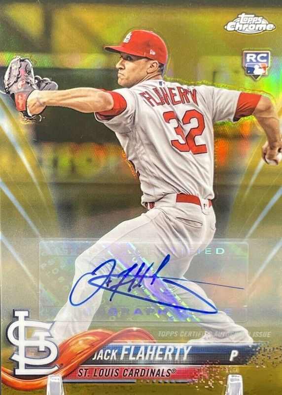 The Jack Flaherty 2018 Topps Chrome Update #HMT18 Autographs - Gold Refractor /50 Rookie card in Raw condition has not changed in price in the last 30 days and was last sold for $22.00 .