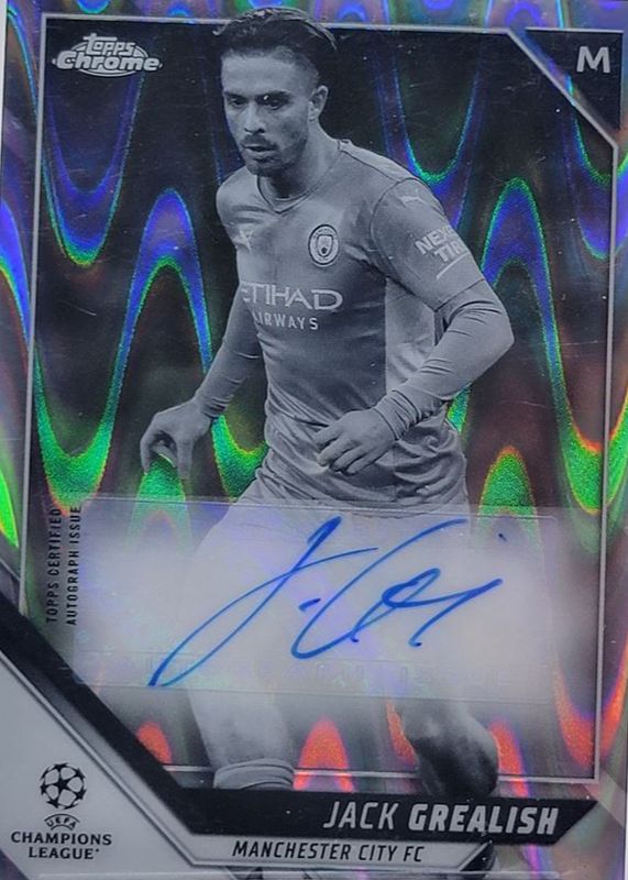 This card is 1 of 14 Jack Grealish's card variations in the 2021 Topps Chrome UEFA Champions League set being tracked by Sports Card Investor, including Autographs, Autographs - Aqua Lava Refractor, Autographs - Gold Lava Refractor, Autographs - Orange Lava Refractor, and Autographs - Aqua Refractor /199.