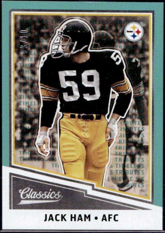 The Jack Ham 2017 Classics #133 Timeless Tributes - Blue /10 card is 1 of 16 Jack Ham's card variations in the 2017 Classics set being tracked by Sports Card Investor, including Base, Glossy, Glossy (Gold Border), Red Back /299, and Blue Back (1st Edition) /175.