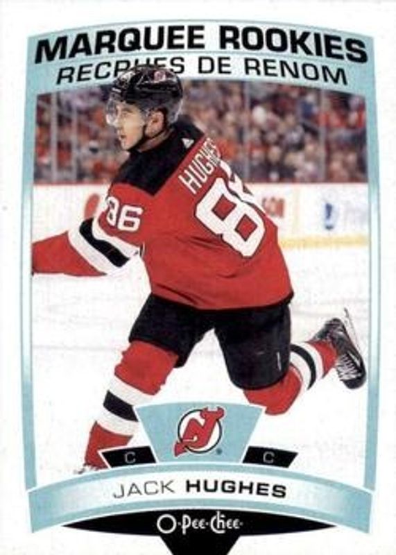 The Jack Hughes 2019 Upper Deck #611 2019 O-Pee-Chee Update Rookie card is 1 of 54 Jack Hughes' card variations in the 2019 Upper Deck set being tracked by Sports Card Investor, including Young Guns Base, Young Guns Canvas, Young Guns - Clear Cut, Young Guns - Clear Cut Exclusives, and Young Guns - Silver Foil.