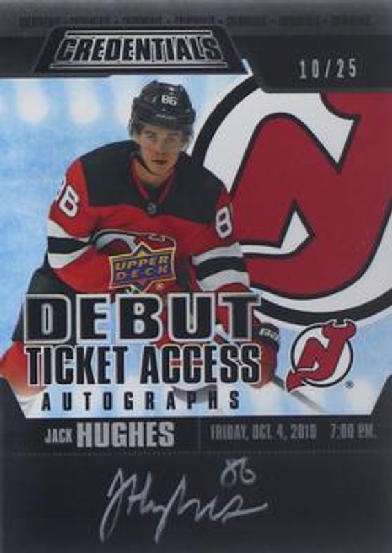 The Jack Hughes 2019 Upper Deck Credentials #VDTAA-JH VIP Debut Ticket Access Autographs /25 Rookie card is 1 of 26 Jack Hughes' card variations in the 2019 Upper Deck Credentials set being tracked by Sports Card Investor, including Base /699, Red /99, Green /25, Purple /10, and Black /1.