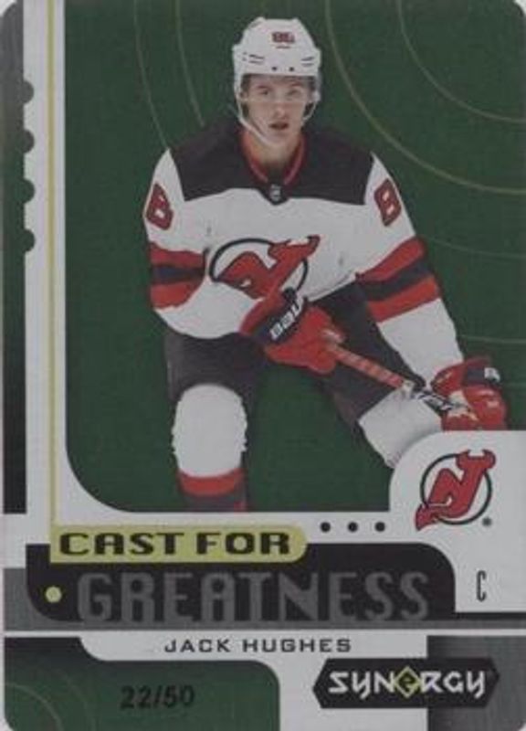 The Jack Hughes 2019 Upper Deck Synergy #CG-36 Cast For Greatness Green Achievements /50 Rookie card is 1 of 21 Jack Hughes' card variations in the 2019 Upper Deck Synergy set being tracked by Sports Card Investor, including Base /19, Red, Red Bounty, Blue /799, and Green /299.