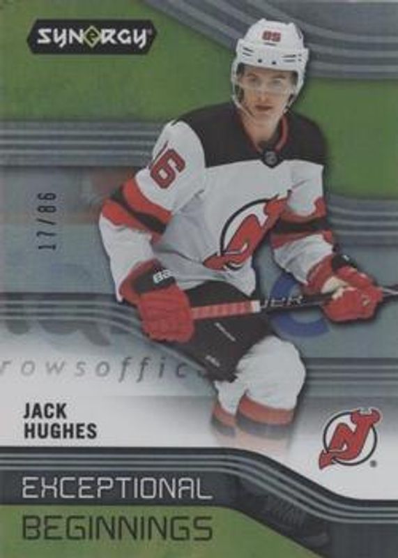 The Jack Hughes 2019 Upper Deck Synergy #EB-28 Exceptional Beginnings Photo Variant Achievments /86 Rookie card is 1 of 21 Jack Hughes' card variations in the 2019 Upper Deck Synergy set being tracked by Sports Card Investor, including Base /19, Red, Red Bounty, Blue /799, and Green /299.