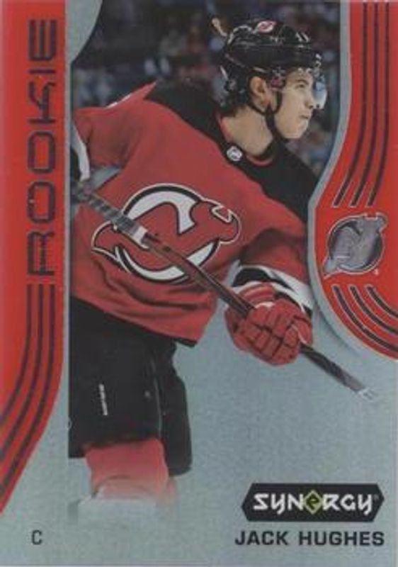 The Jack Hughes 2019 Upper Deck Synergy #100 Red Bounty Rookie card is 1 of 21 Jack Hughes' card variations in the 2019 Upper Deck Synergy set being tracked by Sports Card Investor, including Base /19, Red, Blue /799, Green /299, and Purple /7.