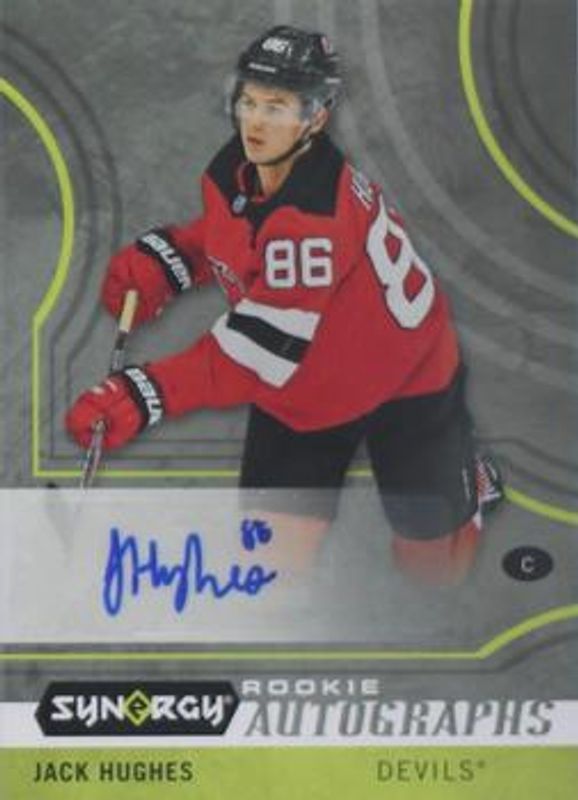 The Jack Hughes 2019 Upper Deck Synergy #A-JA Rookie Autographs card is 1 of 21 Jack Hughes' card variations in the 2019 Upper Deck Synergy set being tracked by Sports Card Investor, including Base /19, Red, Red Bounty, Blue /799, and Green /299.
